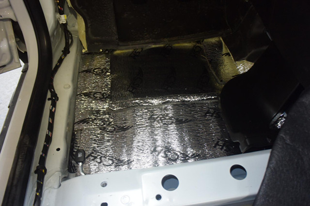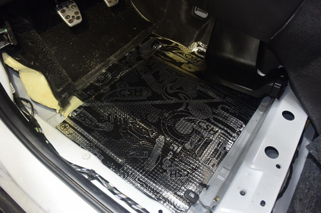 北汽幻速S6整体感觉并没有那么豪华,所以在噪音处理方面较差,为了保证改装音响效果达到最佳,隔音降噪是重中之重的一步。第一步对主副驾驶地板位置进行CSH小炸弹双层隔音处理,最后再做一层CSH珍珠棉,严丝合缝的在主副驾驶位置减振隔音,有效阻止噪音。