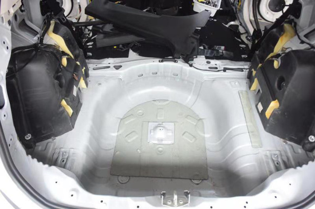 拆开尾箱部分,拆开之后看到没有隔音装置,高速运动下,车身振动会带来较大的噪音。