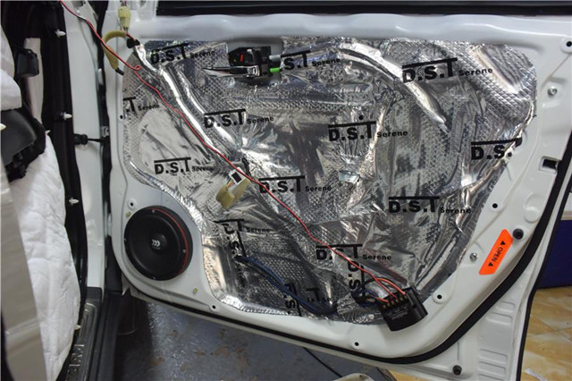 因为原车一般门板都是没有任何隔音的,所以容易振动产生噪音,同时也是非常容易让外部胎噪风噪等传入车厢,从而导致影响音乐享受。所以使用DST双层隔音,来增加内层的厚度,以达到减少震动对音源音质的影响,提升音乐的质感,以让车主得到更好的音乐享受。