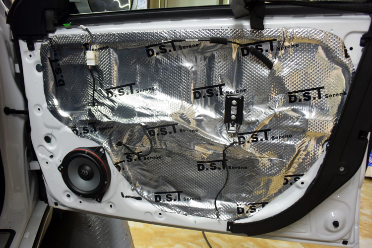 压力神马的都是浮云,改装技师用其最专业的技术一丝不苟的展开音响改装升级工作,第一步就是隔音,虽然是自主品牌里面的豪华车级别,但原车的隔音工作却并不豪华。这一次隔音工作改装技师对四个车门,进行双层隔音,所用材料也是性价比超高的吸音隔热阻燃高档材料。按照车门里板拆开之后的形状进行剪裁,完全严丝合缝的将隔音材料填充在门板内部,待扣上塑料内饰板之后这个车门就会成为一个音箱,喇叭在里面发挥自己更好的效果。