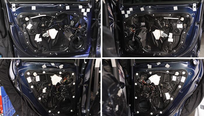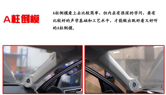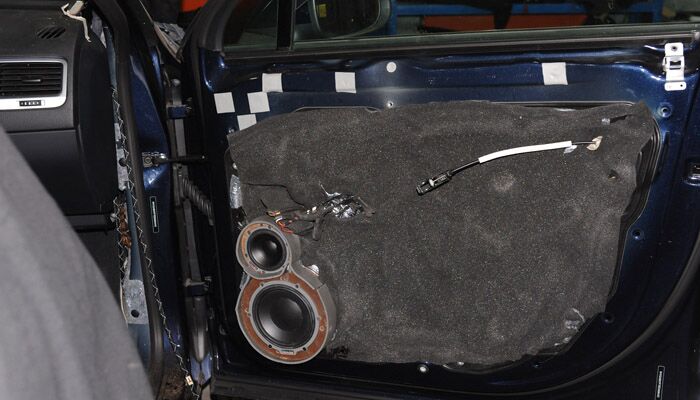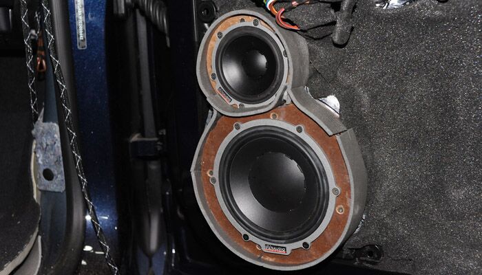 车主要求音响效果至上,所以我们将丹拿Esotar三分频的低音、中音单元一起安装在门板原车喇叭位。