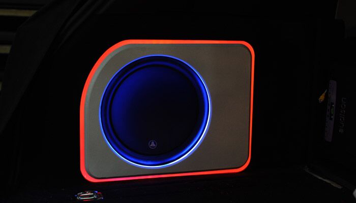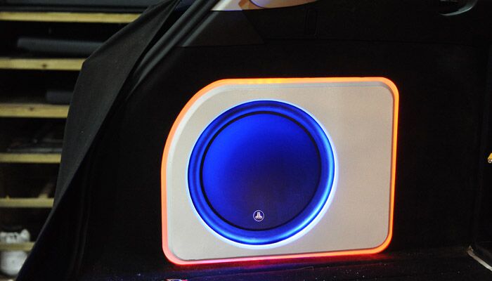 红光搭配蓝光看上去颇为亮眼,整体效果非常好,感觉与原车后备箱有一种融为一体,不会感觉有突兀,外面一层盖板用的是黑色皮包裹,用乳白色手喷漆进行喷绘,看上去非常有质感,即可以远观又可细瞧。