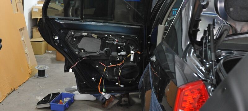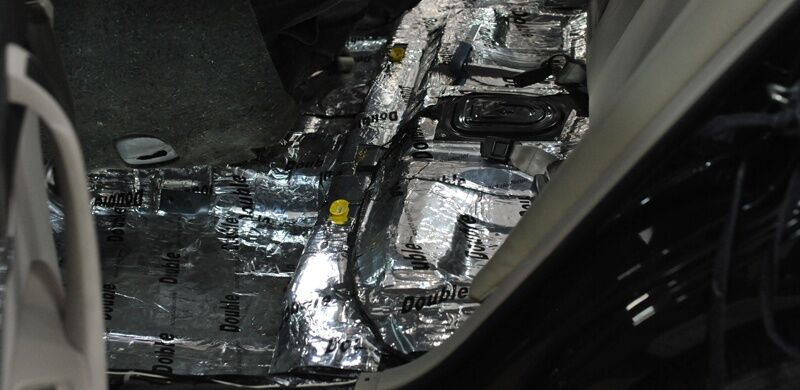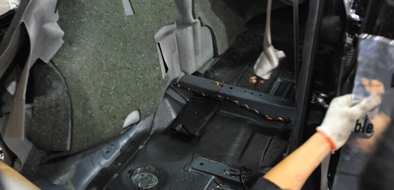 底盘隔音能够大幅度降低路噪的产生,做底盘隔音时要先将车内的座椅全部拆下,再将地毯掀起,露出钢板。