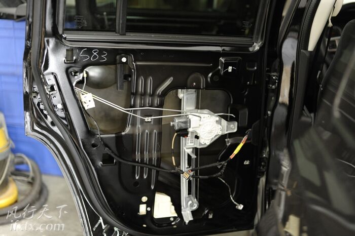 拆开车门,可以很清楚地看到,自由客原车门板上并无任何隔音止振措施。为了让音响效果更好,我们要对其车门做双层隔音处理。