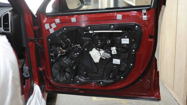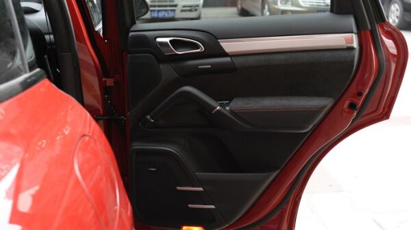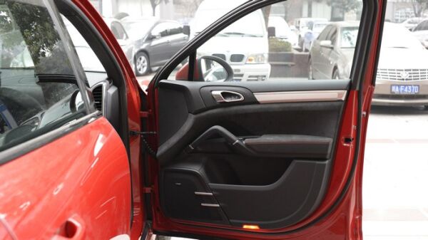 首先做基础的隔音工程:拆开车门可以看到,卡宴在设计时,为了保证高性能,在很多地方都采用了特殊的材料.看下面车门的内层,一般车型都是采用强度够高,但是很厚重的钢板,而卡宴却采用了强度和钢板差不多,但重量轻很多的塑钢材料。