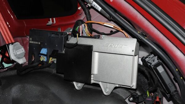 原车尾厢右侧配备了博士多声道功放,内置光纤解码\DSP声场处理。