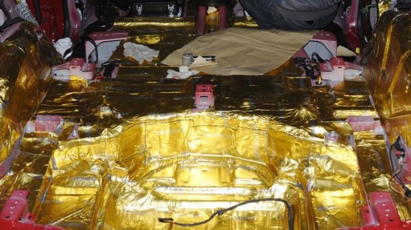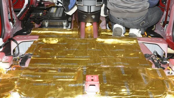 底盘在贴上一层萨迪金甲止振板后,为了加强效果,再铺一层大能低频王,进一步降低低频噪音。