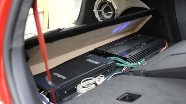 两台功放并列安装在尾厢底部靠后排座椅位置: