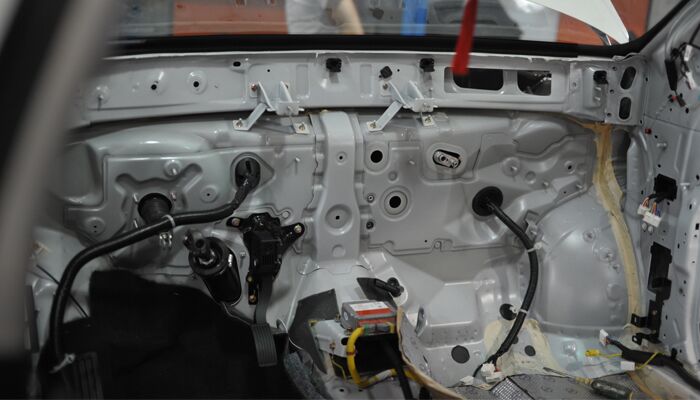 做防火墙隔音之前,我们需要先拆下仪表台及里面的空调,因为仪表台内部结构复杂,拆除中,线路多而且复杂。因此,防火墙隔音是汽车隔音止振工程中技术含量最高、难度系数最大、所需工时最长的项目。