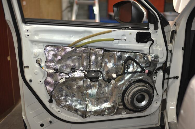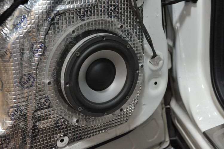 其次是声场喇叭的更换,为了让汽车的声场喇叭有一个良好的工作环境改装技师使用STP隔音材料对汽车的门板做了双层的隔音处理。在隔音的基础上改装技师经过认真的声场定位将前声场喇叭替换成了瑞典DLS 北欧之声三分频套装喇叭,它的高音单元和中音单元被安装在了汽车A柱上,车主可以听到更加宽阔清晰的音乐。