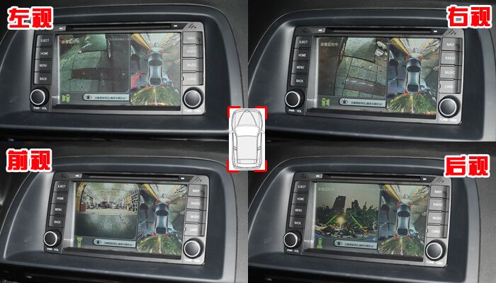全景画面可显示车周围5米的影像、消除视角盲区,避免因视角盲区引发的恶性交通事故发生。让驾车者能在狭窄路段会车、或路边泊车时有更全方位的车辆周边环境监控影像,提高驾驶安全。并同时显示单个摄像头的大幅影像;打左转向显示左边影像,打右边转向显示右边影像,倒车时显示后边影像,前进时显示前边影像。