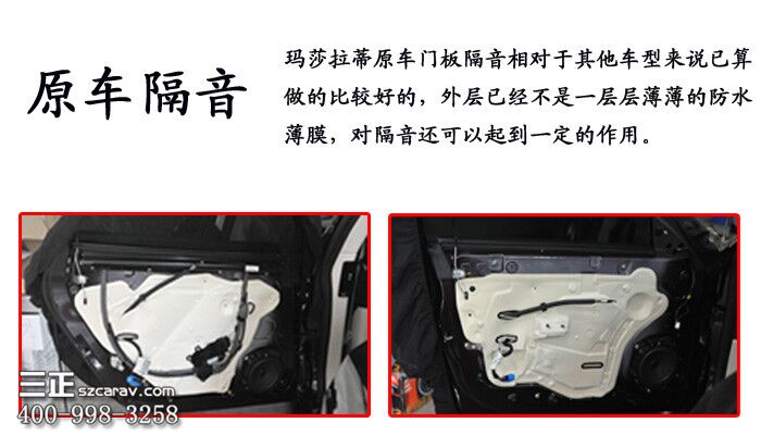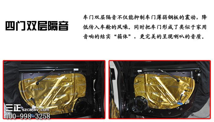 隔音采用了市场上品质最好的纯天然丁基橡胶的萨迪金甲止振板,不仅材料品质好,厚度更是达到了3mm,是某大品牌隔音厚度的2倍!效果自然更佳。
