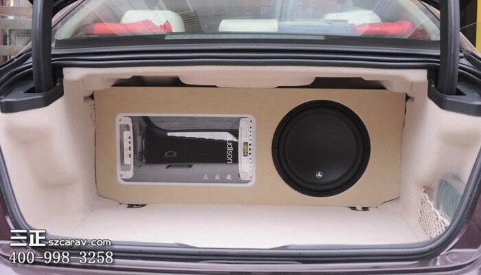 音响器材比较多,只有考虑放在后备箱,跟车主沟通了一下,车主同意占用小量的后备箱空间进行尾箱造型。