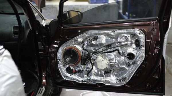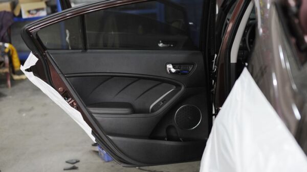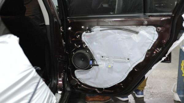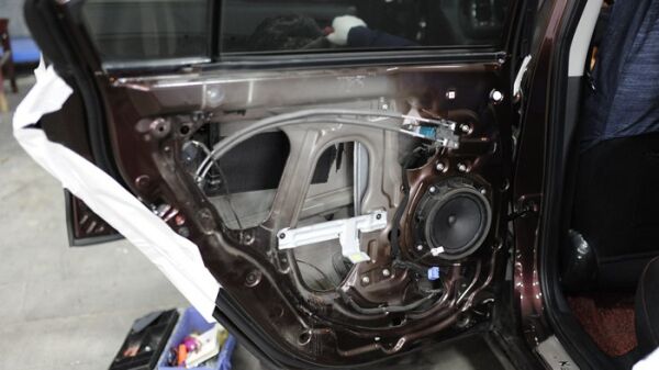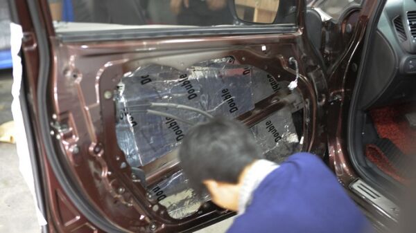 进行第3步:四门隔音,车门是双层钢板结构,先在内层贴一DOUBLE顶级隔音止振王,其作用是减振、降噪。