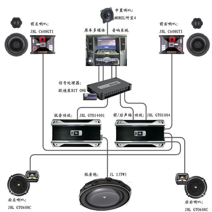 这套音响基本上可以满足对音质没有要求的一般车主,但之于对音乐品质要求极高的本车车主梁先生来说,远远满足不了要求,原以,原车BOSE博士音响只能“靠边站”了。所以找到我们进行全方位的升级改装。梁先生喜欢听清脆、明亮,节奏快,动态大的交响乐、蓝调、慢摇音乐。为此我们为梁先生“量声定制”的是美国JBL音响。全套方案配置图如下: