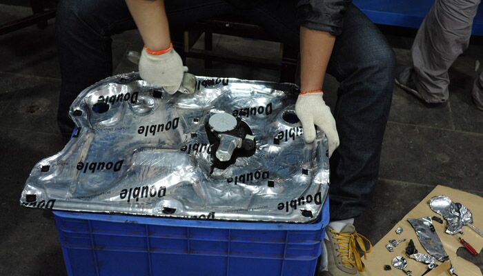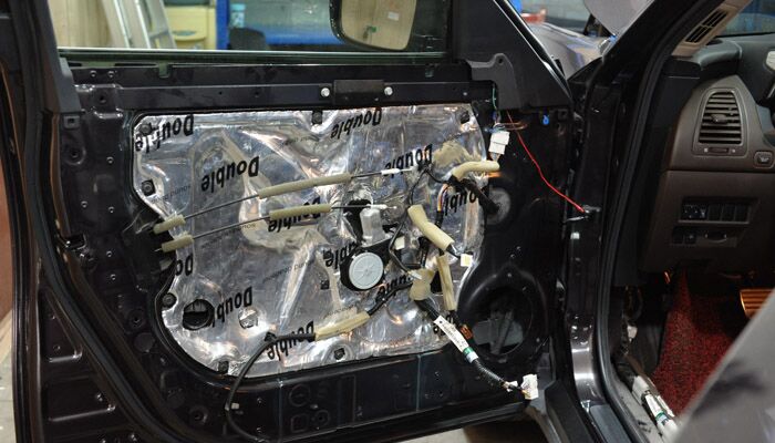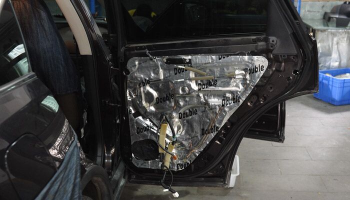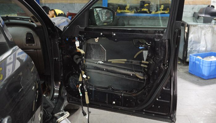 确定改装方案之后,开始施工。首先拆开车门,做四门双层隔音。