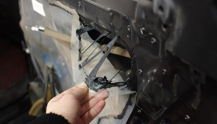 前车门稍好一些,夹层钢板块整体冲压成型的。拆除夹层钢板后,准备在内层钢板上粘贴隔音止振材料。