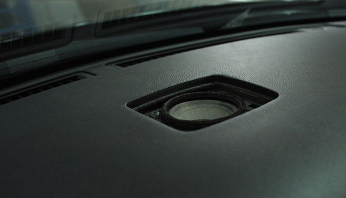 高音喇叭安装到仪表台原高音位的效果如下,再盖上原车的高音网罩之后,从外面就看不到任何改装的痕迹了。