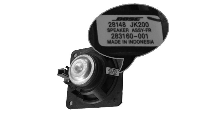 中高音喇叭为3寸纸盆喇叭,MADE INDONESIA(印度尼西亚制造)。前面我们谈到了原车音响的极高频薄弱,声音细节缺失的元凶就是这个3寸的喇叭。因为3寸锥盆喇叭单元中频表现会很好,但12KHZ以上的极高频非常差。如果英菲尼迪的工程师在设计时,用这只喇叭做为中音单,另外再在A柱上设计一对高音喇叭单元,前声场组成3分频,相信效果会有质的飞跃。