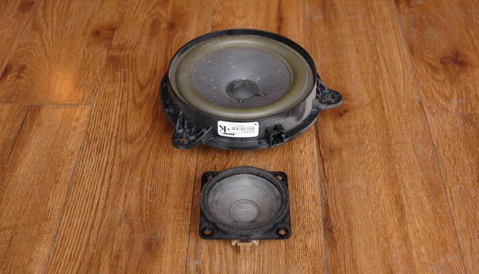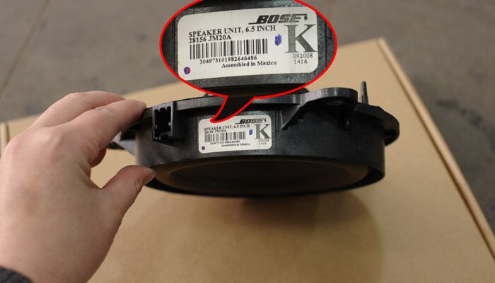 首先看看原车的BOSE 6.5英寸低音喇叭,MADE IN MEXICO(墨西哥制造)。第一眼看上去,质感很差。廉价的纸盆、脆弱的塑料盆架,拿在手里轻飘飘的。如果标价100元/只,不知道有没有愿意买呢?