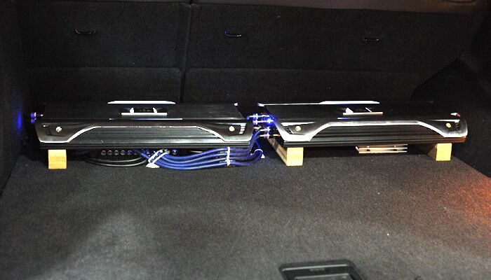两台JBL功放都直接平铺安装到尾厢底上面。左边这台功放下面安装的是欧迪臣BIT ONE信号处理器,右边功放下面安装的是一只握手3.3法拉的电容。