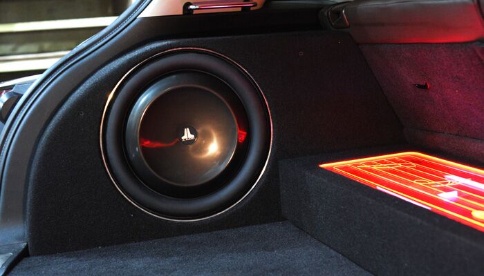 4.低音炮搭配的是美国捷力JL 13英寸的13TW5这款低音喇叭。之所所以选择款超薄型的低音,是因为车主不愿意占用后备厢空间。普通的低音炮个头庞大,对音箱的容积要求也很大。而JL 13TW5这款超薄低音,安装深度仅6.5CM,密封箱体容积仅需22.7L,可以很方便地安装到狭小的位置。更重要的是,捷力这款13英寸的超薄低音功率高达600W,低音弹性非常好,低音下潜深,速度快,完全不输同级别的常规低音炮。