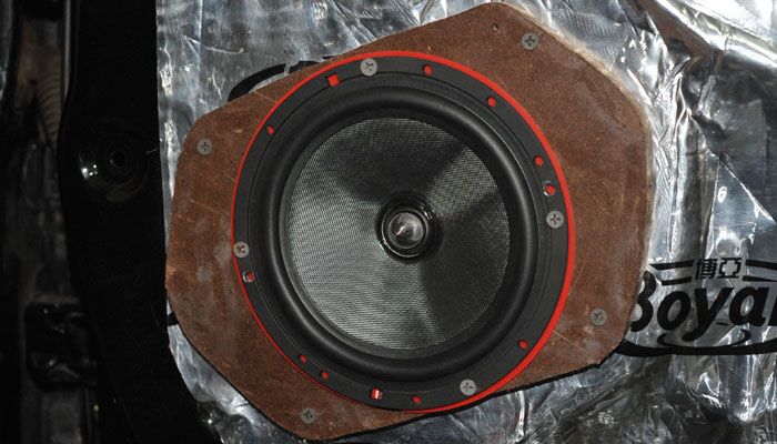 中低音喇叭安装细节图,木垫圈防止门板共振,防水罩避免雨水淋湿喇叭,受潮短路,增长喇叭使用年限。