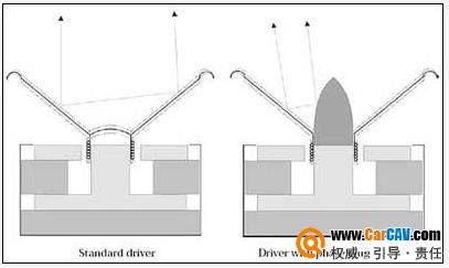 针对上述的情况,通过增加相位锥,在很大程度上可以对问题加以有效改善。从下图中我们可以清楚地看见,由于相位锥本身并不随音盆共同振动发声,因而当音盆发声时,通过在音盆中间位置增加相位锥,音盆内侧所发出的声波能够及时得到反射,从而有效地修正其反射角度和相位,并缩短时间差;同时,相位锥的反射使用,也能够显著地扩宽中高频信号的扩散角度,让中高频声波能够在更宽阔的空间内进行良好的传播。