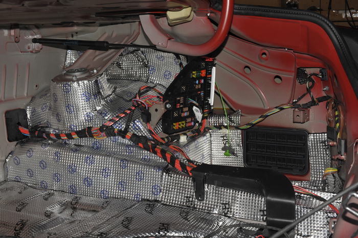 尾箱是汽车最容易产生共振的地方,宝马640i原车的尾箱又没有做有效的止振处理,所以汽车在运行的过程当中非常容易产生噪声,重庆三正的改装技师对汽车的尾箱做了双层的止振隔音处理,既有效的降低了汽车共振产生的噪声,同时又保证了汽车良好的密封性,可谓是一举两得。