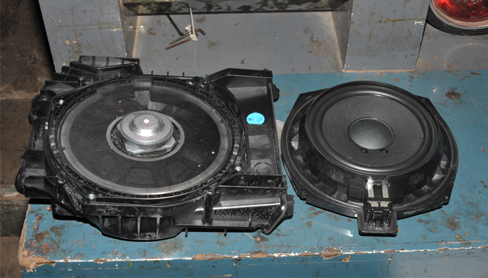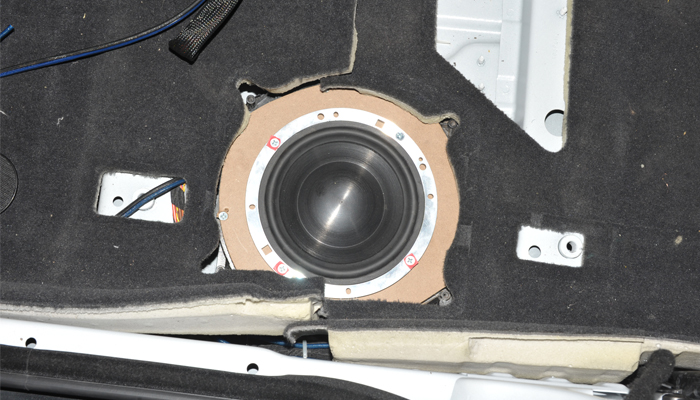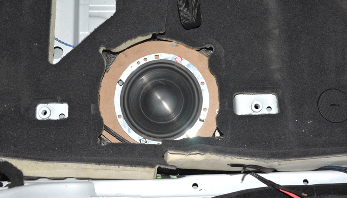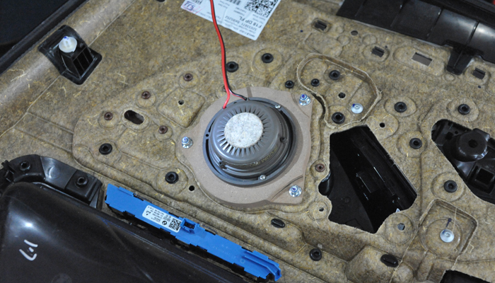 宝马原车中低音位于前排座位下面,使用专用的箱体安装,本次无损安装只需要将原车喇叭换掉即可。