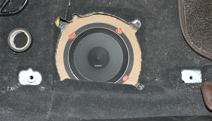 本次改装所有喇叭均采用原位安装。前声场中低音位于座位下面,原车中低音是有专用箱体,将原车中低音拆下换上我们的欧迪臣中低音原位安装即可。
