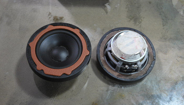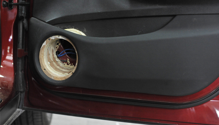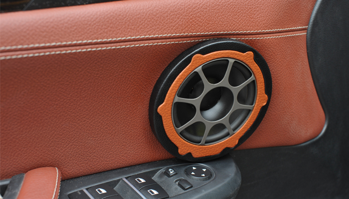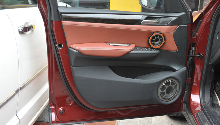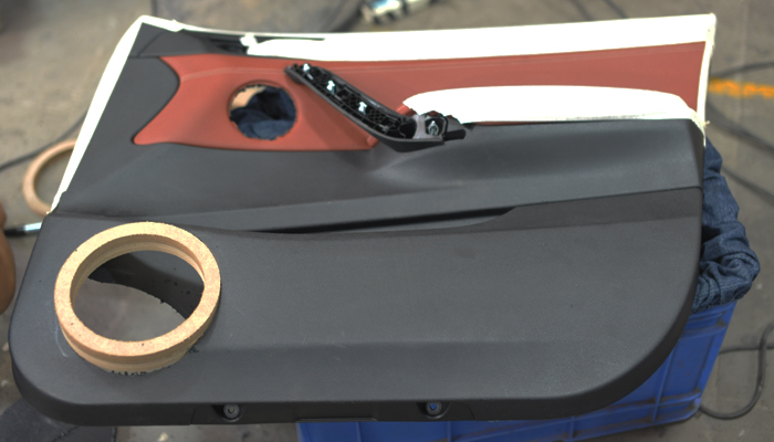 宝马中低音位于前排座位下面,这个位置并不能完全发挥出喇叭应有的效果。车主改装之后听了一段时间发现中低音并不能达到喇叭应有的效果,于是决定将中低音喇叭倒模安装到门板上。