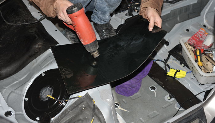 STP V卫士需要用烤枪进行加热才能更好的粘贴到底板上,在STP V卫士隔音的基础上再加一层大能温莎隔音棉,最大限度的吸收底板噪音。