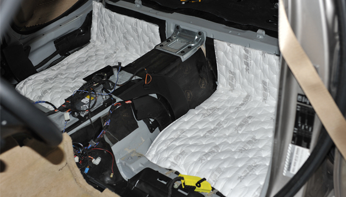 发动机噪音通过引擎盖传播到驾驶室,车主非常烦恼,所以我们针对引擎盖采用的是俄罗斯进口全球隔音材料中最顶级的隔音材料STP炸弹进行隔音降噪处理,4.2MM的厚度、全新的隔音技术傲视隔音产品内任何材料。