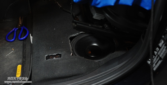摩雷意蕾9三分频的9寸低音也是在前排座椅底下原位安装。虽然原车低音是8寸,但安装9寸的意蕾低音单元空间恰到好处。若再大一点或厚一点的喇叭就装不进去了。