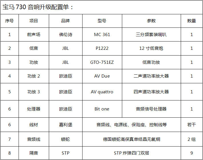 话说宝马7系原车音响系统还不错,但是车主要求非常高,原来车上拆下来的器材只用了一个低音一个功放,其它器材全部升级,车主耳朵也是愈发灵敏,原来的系统已经不能满足,这次陪同车主试听将近一个小时,最后确定以下配置。