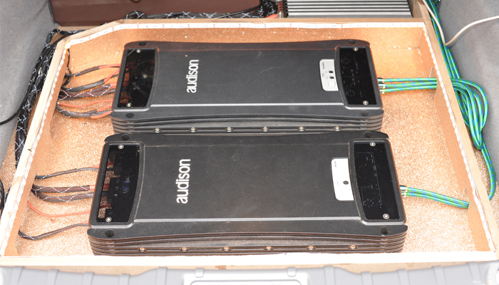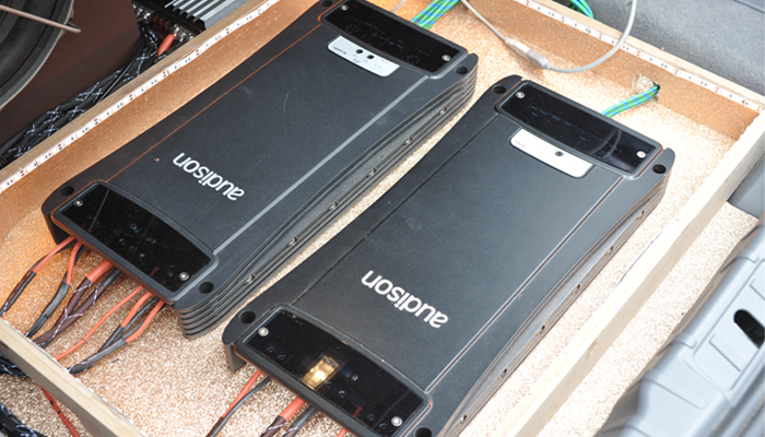 欧迪臣的二路功放和四路功放并排安装在后备箱里。