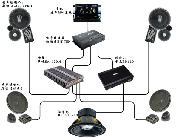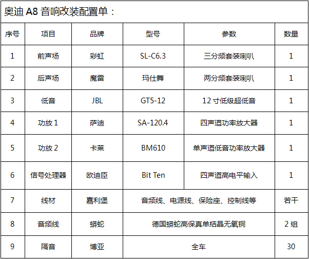 车主喜欢听抒情人声、轻音乐,兼顾流行音乐,所以选择了声音清晰通透的德国彩虹喇叭,搭配国产高性价比功放——萨迪,低音采用美国JBL,全套配置如下: