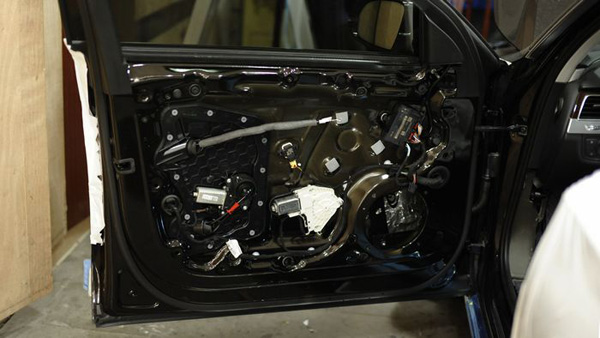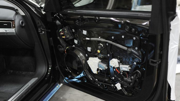 A8L的做工的确非常扎实,门板的螺丝非常隐藏,卡扣也非常坚实,稍不注意,就可能拆坏车门。不过我们的技师经验非常丰富,三下五去二就把车门拆光了。