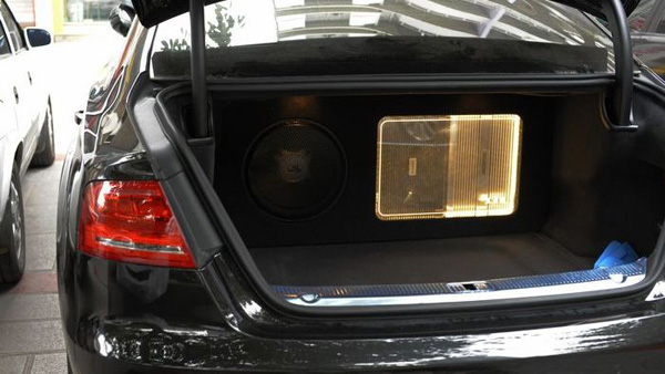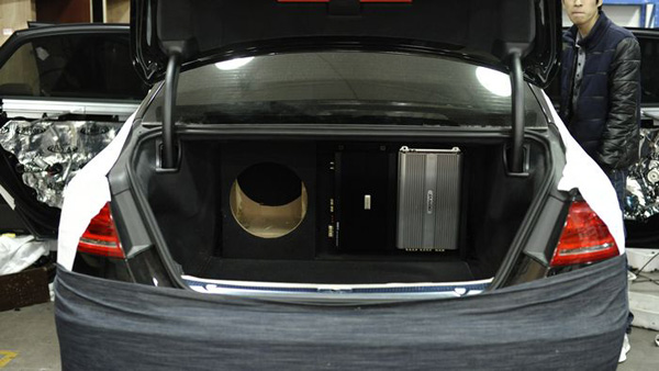 为了节省空间,功放和低音炮都紧凑地安装在尾厢靠后排座椅靠背的位置。保持原厂风格,箱体和功放安装模具都使用和A8L尾厢绒布相近的灰色绒布。