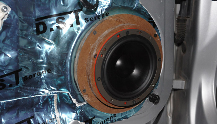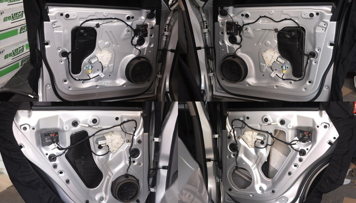 喇叭原位安装,中低音安装在门板上,加装木垫圈进行止震处理,加装塑料防水罩,防止喇叭受潮受损短路。