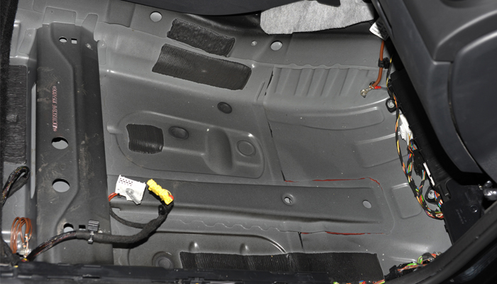 可以看出原车地板只是零星的粘贴了一点隔音材料,这样肯定是不会有好的隔音效果。