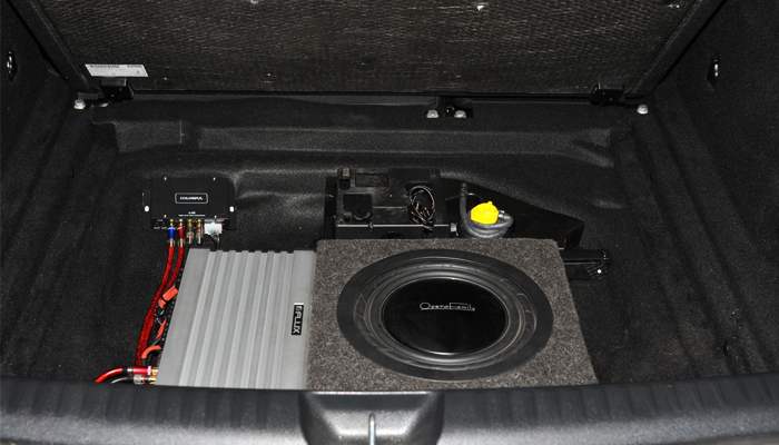 歌剧世家VS10S超薄低音倒模安装到后备箱下层储物空间中。德国佛伦斯四声道功放FS804功放就安装到低音箱旁,不去占用后备箱上层任何一点储物空间。