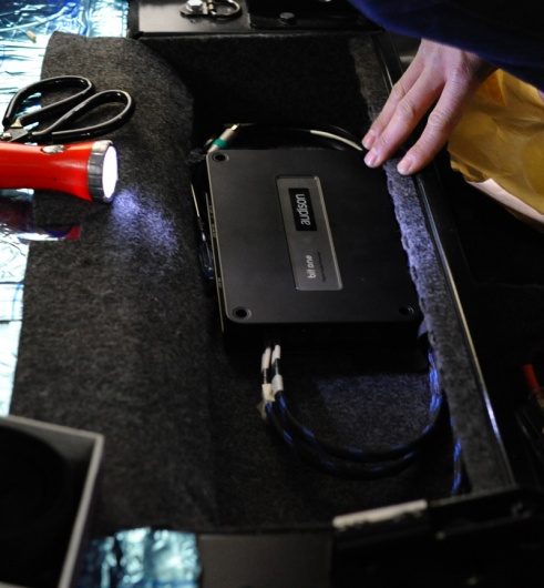整套系统总共三台功放,对功放的安装设计也必定是匠心独运,既要考虑整体的美观度,又得考虑节省车内空间,还要考虑到是否方便调试。经过我们工程师们的精心考虑,决定将三台功放分别做如下安装: