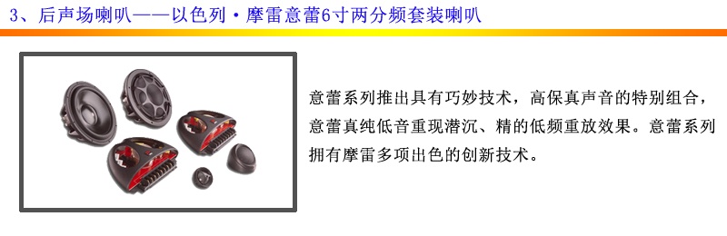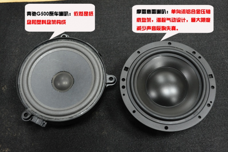 原车喇叭与摩雷意蕾喇叭的对比,不难看出,G500的原车音响效果差跟其喇叭本身有很大关系。原车喇叭和摩雷意蕾喇叭对比起来真是天壤之别,原车喇叭做工用料简单,而意蕾系列具有独特的技术和高保真的声音效果,潜沉而精确的低频重现是意蕾真纯低音的特性,意蕾系列喇叭是摩雷系列中的顶级组合。这也是车主选择的主要原因。当然还有许多品牌喇叭可供车主选择,但摩雷的魅力还是让不少人为之倾倒!