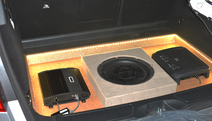 功放、低音倒模安装在尾箱,打上灯光,最上面盖上亚克力板,效果非常出众。
