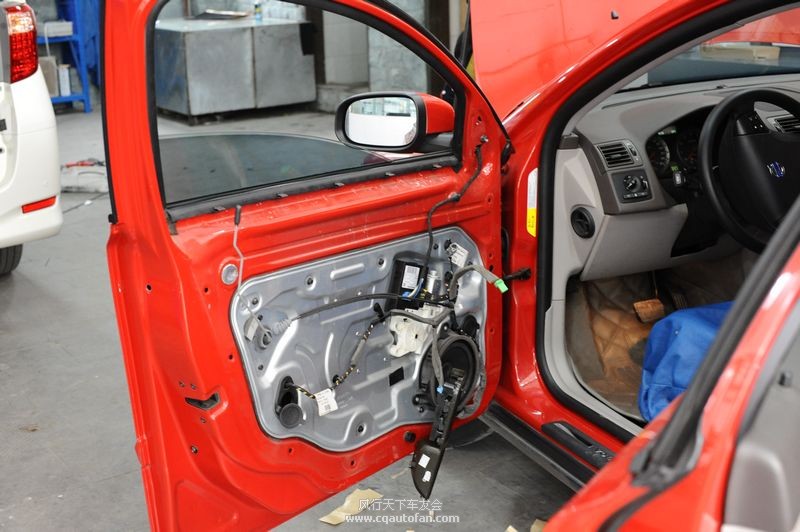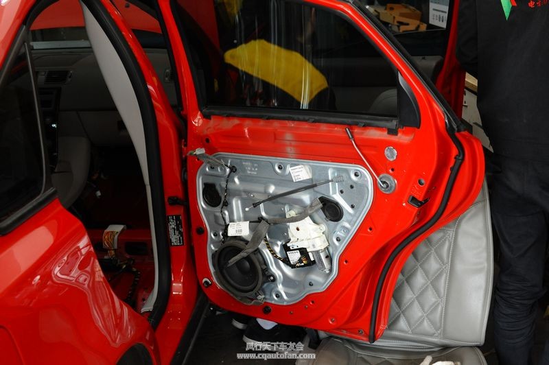 很快的,车门塑料门板被熟练地拆下来了,露出“光秃秃的钢板”。