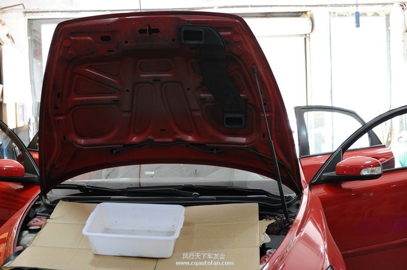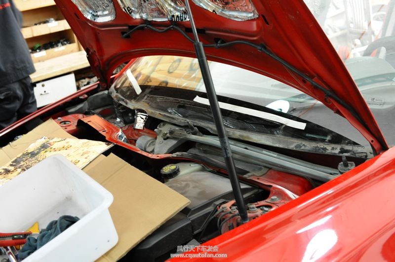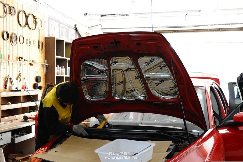 再按照引擎盖的内部结构,将隔音材料美美地贴上去。