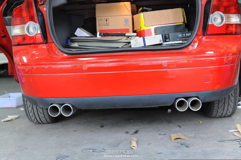 在介绍尾箱隔音前,先让我们看看车主的动力改装。此图为加装的双排气管,看上去是不是很给力!:lol: 可动力提升的同时,汽车的噪音也会随之加倍增加,所以车主要“斥巨资”改善s40的噪音问题。
