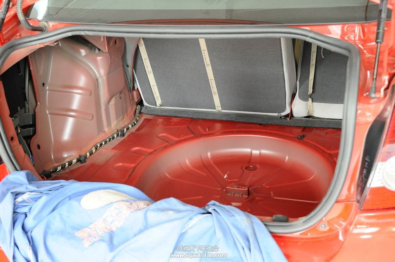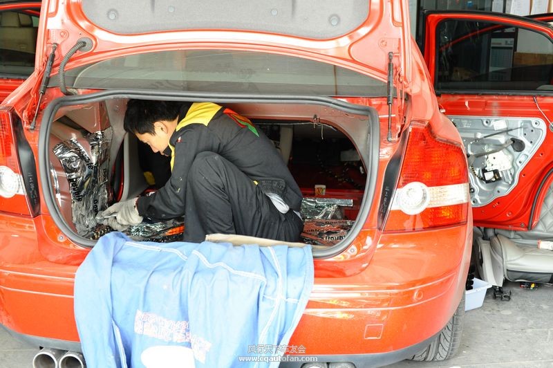 粘贴隔音材料:由于s40的尾箱开口相对较低,所以我们的工程师不得不“蜷”在里边儿做隔音。